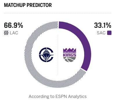 今日ESPN晒出本场获胜概率预测,快船高达66.9%,国王仅有33.1%。